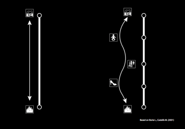 男性的日?;顒?dòng)路線(xiàn),通常是直線(xiàn)性的,從家到辦公地點(diǎn);而女性的日?;顒?dòng)路線(xiàn)要彎曲一些,她們除了工作,還要購(gòu)物和照顧孩子。因此,應(yīng)男性需求組織的交通
