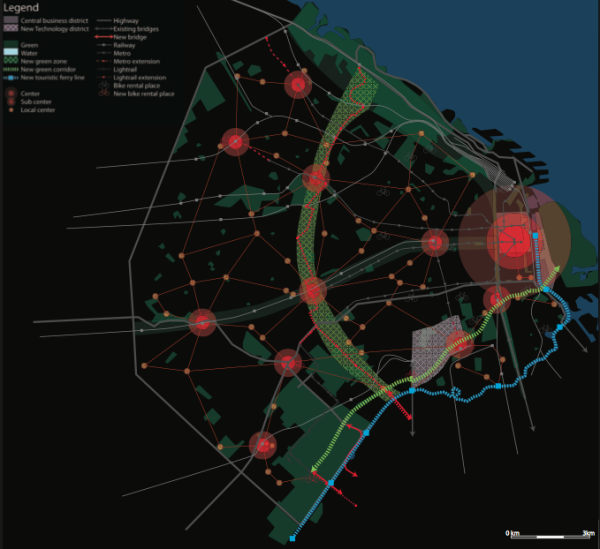 結(jié)合Greed的理論,在最后的策略性規(guī)劃中,我們?cè)诓家酥Z斯艾利斯大都市區(qū)、布宜諾斯艾利斯中心城區(qū)和項(xiàng)目基地三個(gè)尺度,分別從公共交通、中心和環(huán)境三方面提出策略。