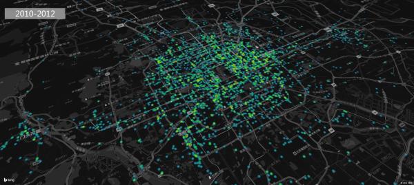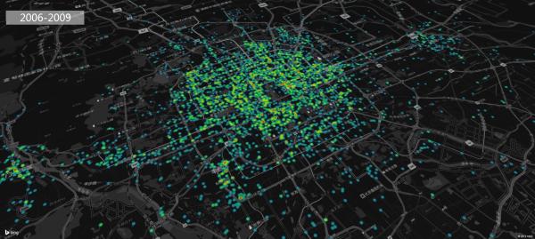 有趣的是,隨著時間流逝,文創(chuàng)企業(yè)消失的數(shù)量逐漸減少,且消失的企業(yè)沒有特別明顯的聚集性。但是,2006-2009年消失較多的區(qū)域集中在宣武門、和平里、東四、中關(guān)村等地區(qū),2010-2012年,消失較多的區(qū)域集中在東四、阜成門、前門、中關(guān)村等地區(qū)。因電商崛起和市場規(guī)整化,中關(guān)村地區(qū)的計算機服務(wù)業(yè)大量消失。而宣武門等2環(huán)以內(nèi)的地區(qū),則可能由于房租上升(東四),或重新規(guī)劃(前門)導(dǎo)致大量企業(yè)外遷或干脆閉門謝客。