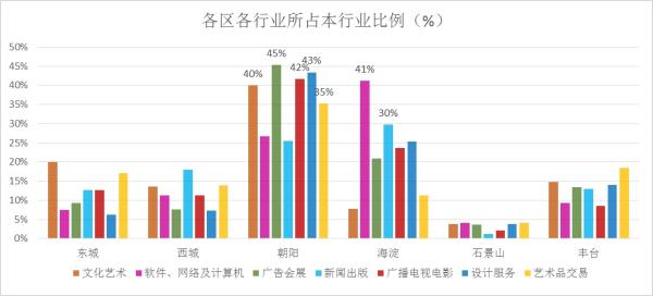 從各區(qū)來看(圖3),朝陽的文創(chuàng)企業(yè)在文化藝術(shù)、廣告會展、廣播電視電影、設(shè)計服務(wù)等4個行業(yè)都占據(jù)了各行業(yè)40%以上的份額,海淀區(qū)的計算機服務(wù)和新聞