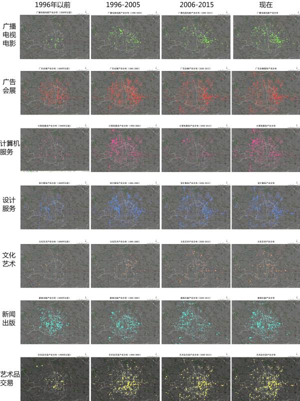 我們以1996年和2005年作為分界線,對各產(chǎn)業(yè)的空間分布進行一個展示。