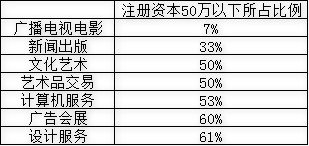假設(shè)我們認(rèn)為50萬元注冊資金以下為微小企業(yè),那么表2中,除廣播電視電影行業(yè)和新聞出版以外,微小企業(yè)在其他行業(yè)中占比都超過了50%。看來,文創(chuàng)產(chǎn)業(yè)低門檻的特性,導(dǎo)致微小企業(yè)成為主要力量,而廣告會展和設(shè)計服務(wù)則由于硬件要求低、腦力勞動為主,成為最容易進入的產(chǎn)業(yè)。