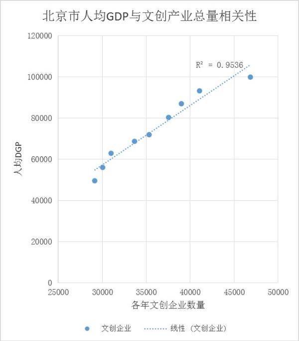 而和北京市2006-2015的人均GDP對比,可以發(fā)現(xiàn),其和文創(chuàng)產(chǎn)業(yè)的繁榮呈高度相關(guān)性,說明經(jīng)濟基礎(chǔ)決定上層建筑,文創(chuàng)產(chǎn)業(yè)的發(fā)展和北京市的經(jīng)濟發(fā)展息息相關(guān),