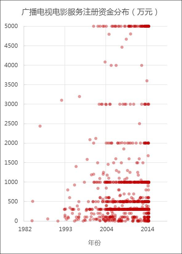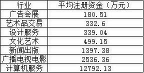 (12792萬元),這個數(shù)字是第二位的廣播電視電影行業(yè)的平均注冊資本(2536萬元)的5倍。平均注冊資本最低的,為廣告會展行業(yè)(181萬元),不