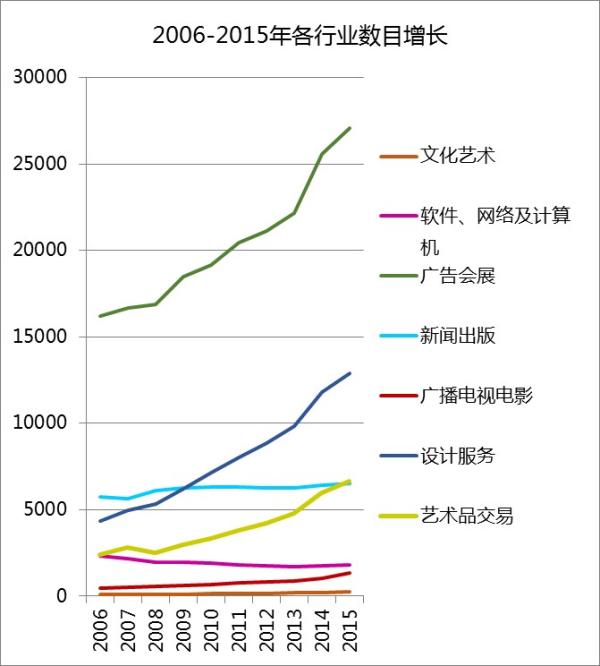 取最近10年的數(shù)據(jù)看,在北京的文化創(chuàng)意產(chǎn)業(yè)中,除了計算機服務(wù)行業(yè)的企業(yè)數(shù)量在過去十年處于下降趨勢之外,其他行業(yè)均在十年間保持增長,尤其在2008