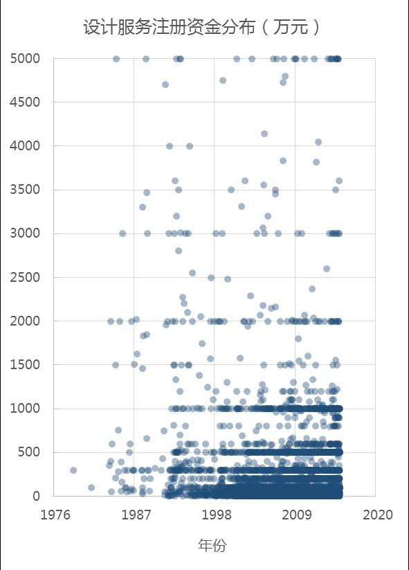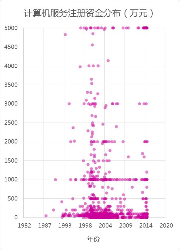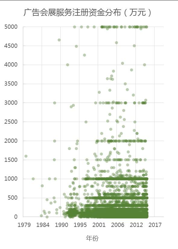 時間越靠后,注冊資金有增大趨勢。廣告會展服務(wù)的規(guī)模以上(1000萬元注冊資金)企業(yè),集中在2011-2015年間成立;計算機服務(wù)的規(guī)模以上企業(yè),
