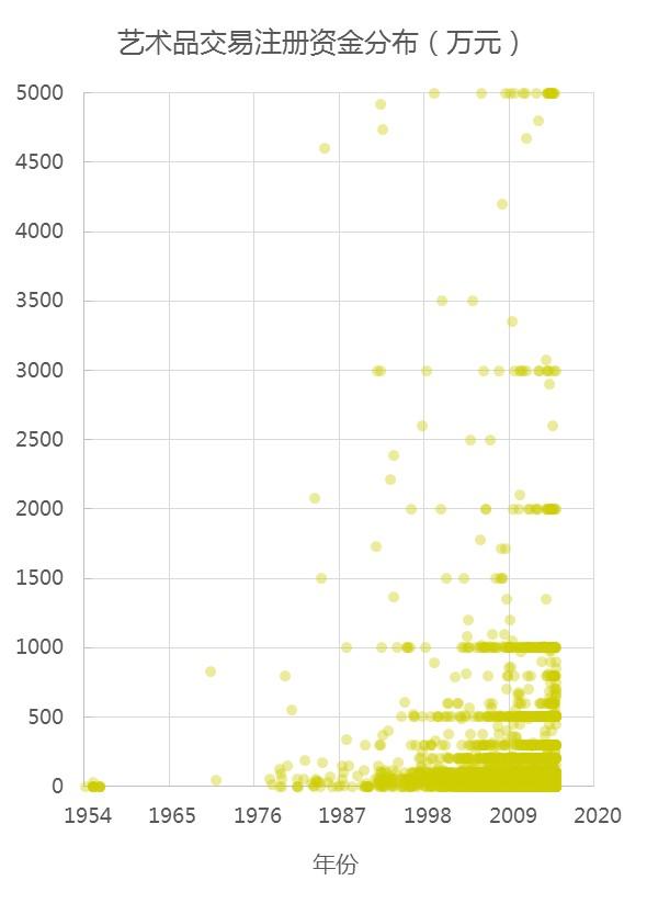 據(jù)不同的行業(yè),在時間維度上,我們做了一個注冊資金的分布圖(圖7),從中能看出各個行業(yè)在不同時間段發(fā)展的趨勢。變化幅度比較明顯的是藝術(shù)品交易行業(yè),