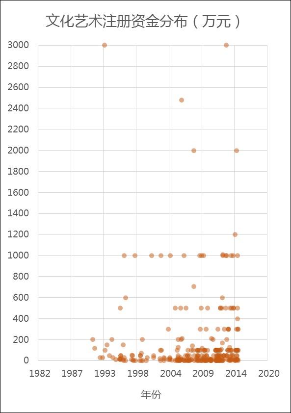 集中在1998-2002年期間成立。同時,這也是計算機服務(wù)發(fā)展的黃金時期。文化藝術(shù)產(chǎn)業(yè)從1993年至今都發(fā)展平平,資金規(guī)模變化不大。