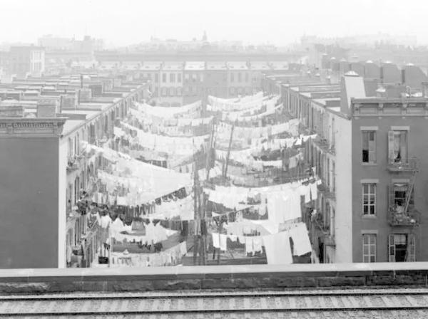 圖為紐約的一個(gè)普通社區(qū)(1900年)。每幢住宅的居住密度極高(嚴(yán)重的群租);生活設(shè)施陳舊;居民收入水平較低(多為新移民);公共空間被晾曬的衣物侵